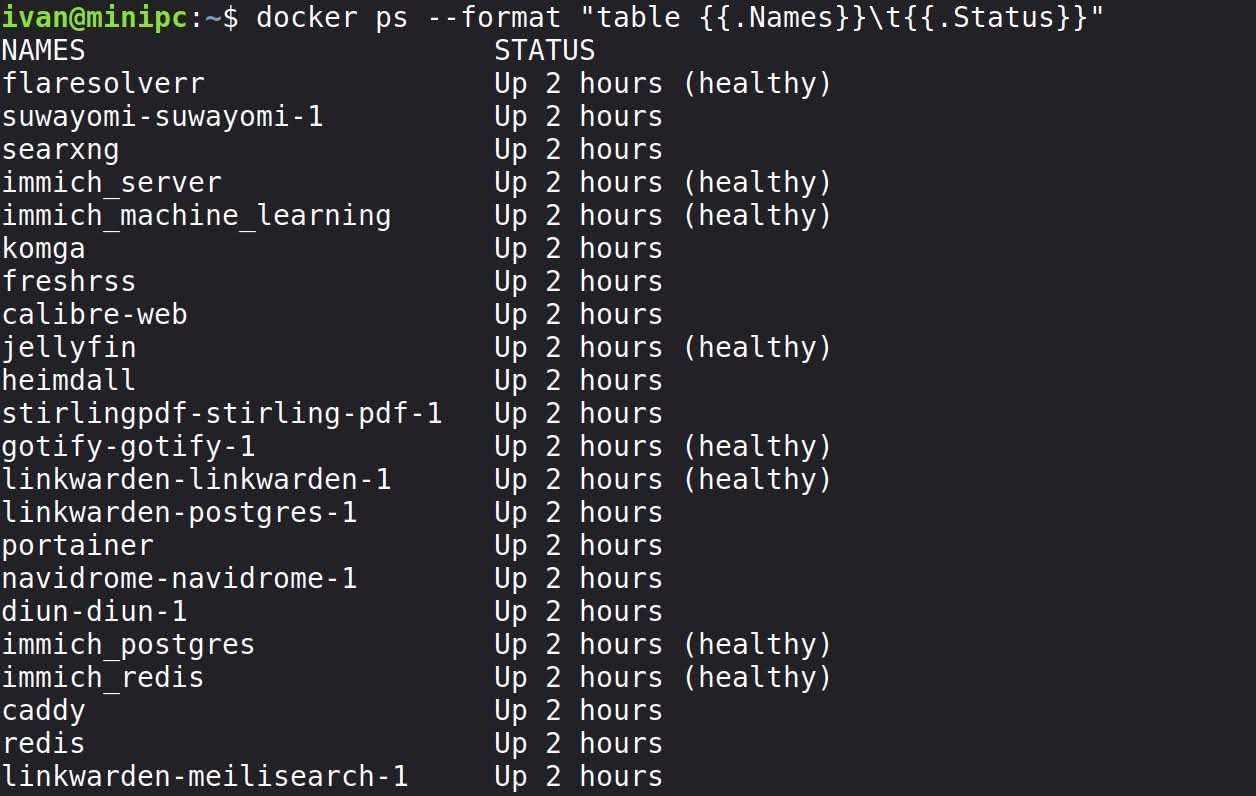 docker ps --format "table {{.Names}}\t{{.Status}}"