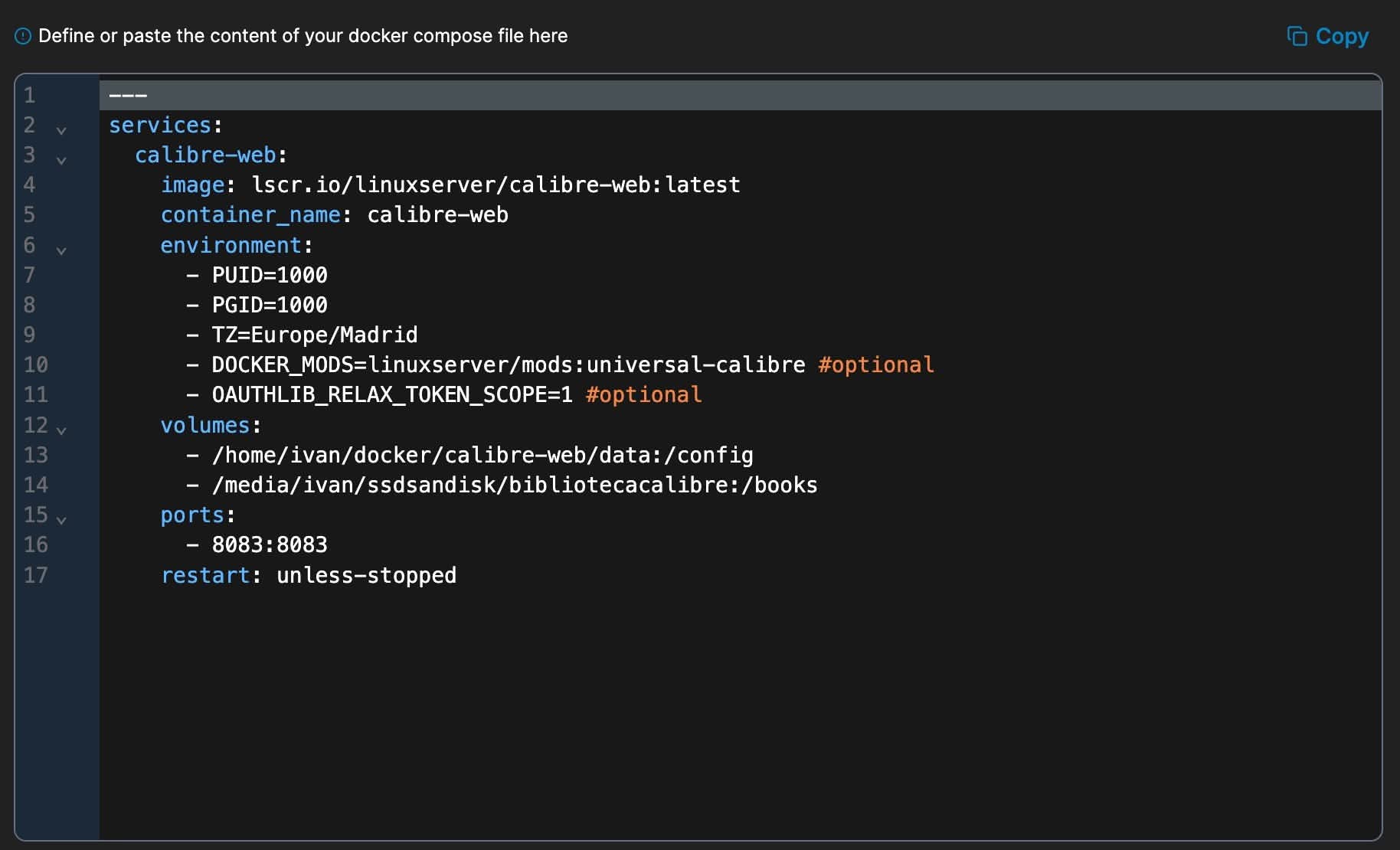 Vamos, que te recomiendo que en tus contenedores pongas: restart: unless-stopped, como, por ejemplo, en este archivo de configuración de Docker Compose para Calibre-web:
