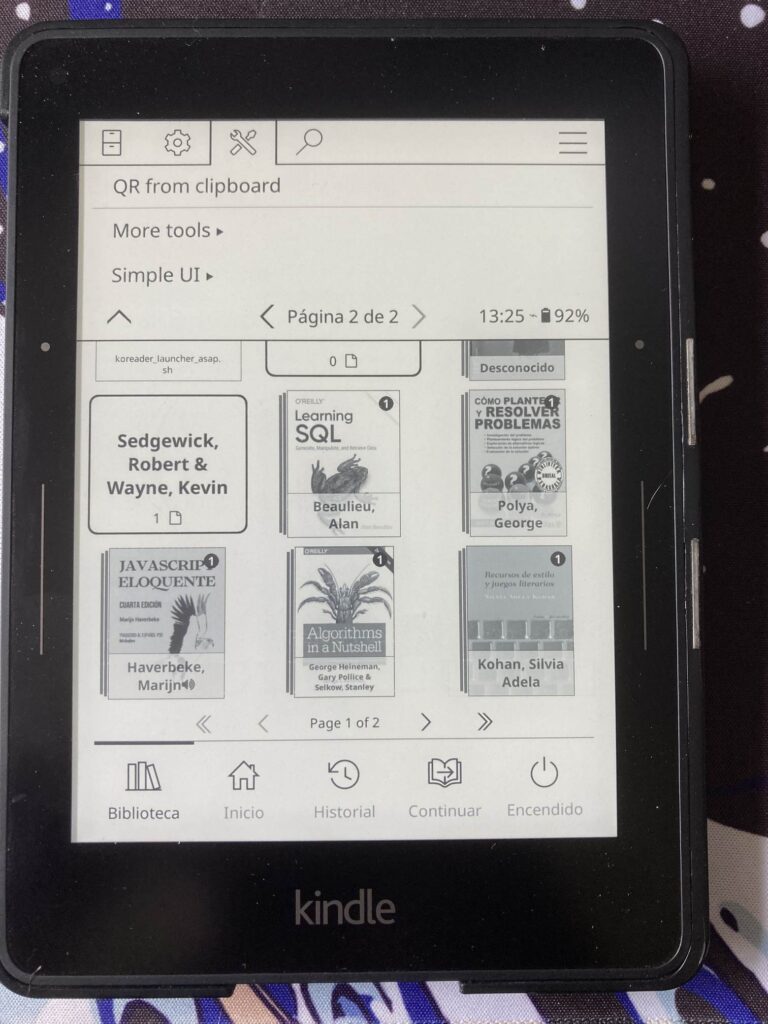 Después de reiniciar, vamos a KOReader, abrimos el menú superior y en la pestaña herramientas tienes que tener un nuevo apartado llamado Simple UI (buscas en la página 2/2).