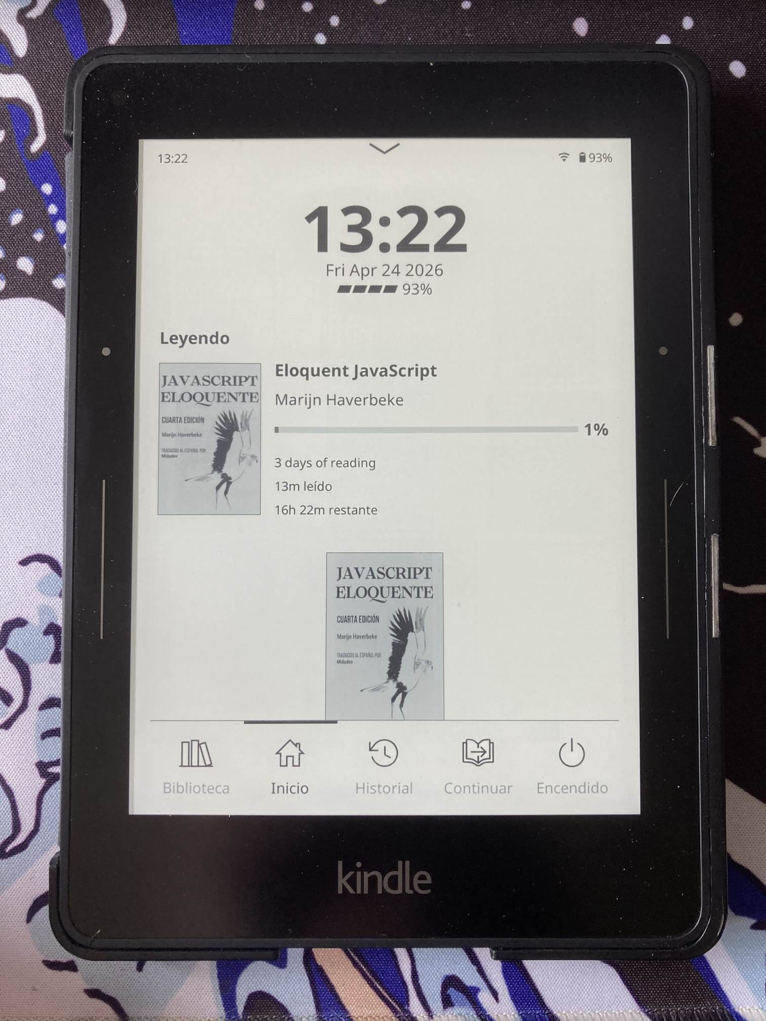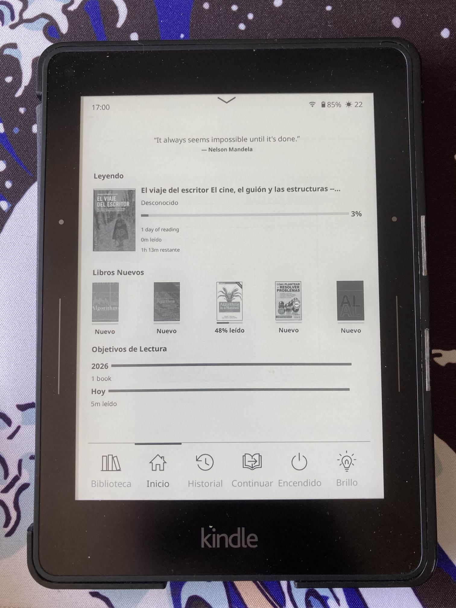 - Inicio: verás el libro que estás leyendo con una barra de progreso.