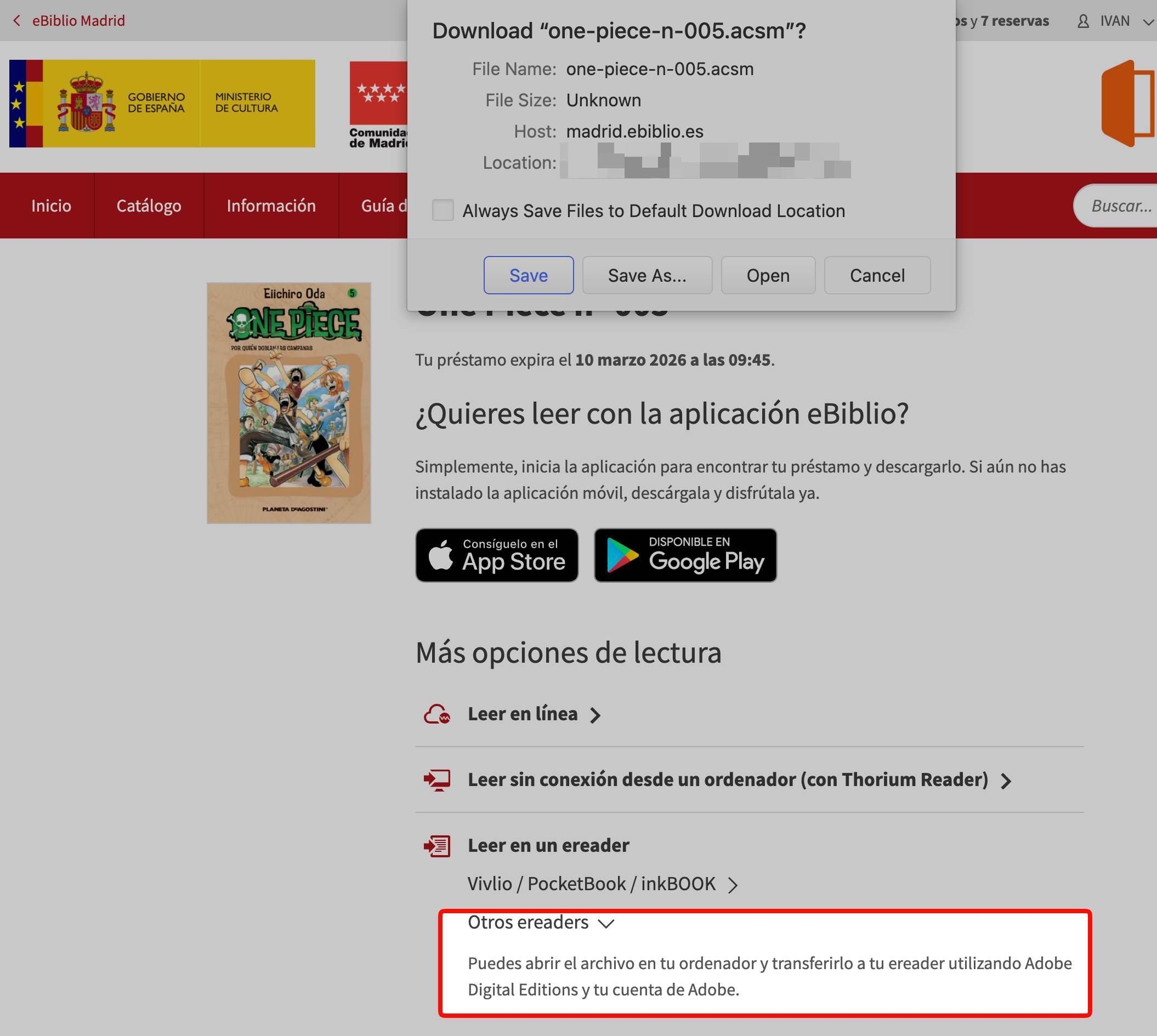 - Puedes transferir a tu lector un archivo protegido con .acs (Adobe Digital Editions). Necesita cuenta de Adobe.