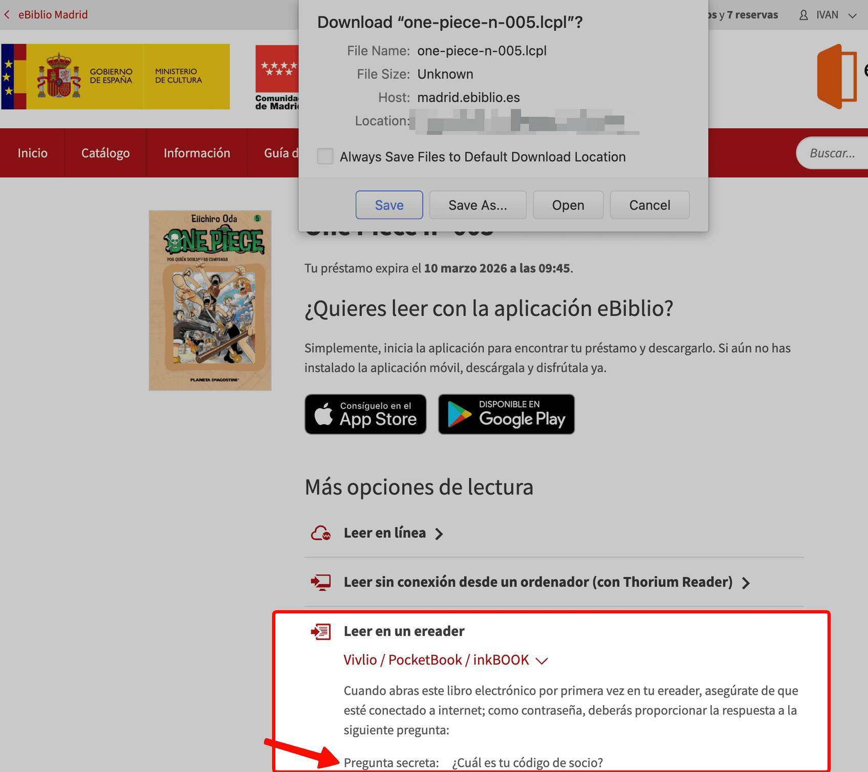 - Acceder a eBiblio en tu ordenador, descargar el archivo .lcpl y luego meterlo en tu eReader conectando mediante cable a tu PC. Abres el archivo.