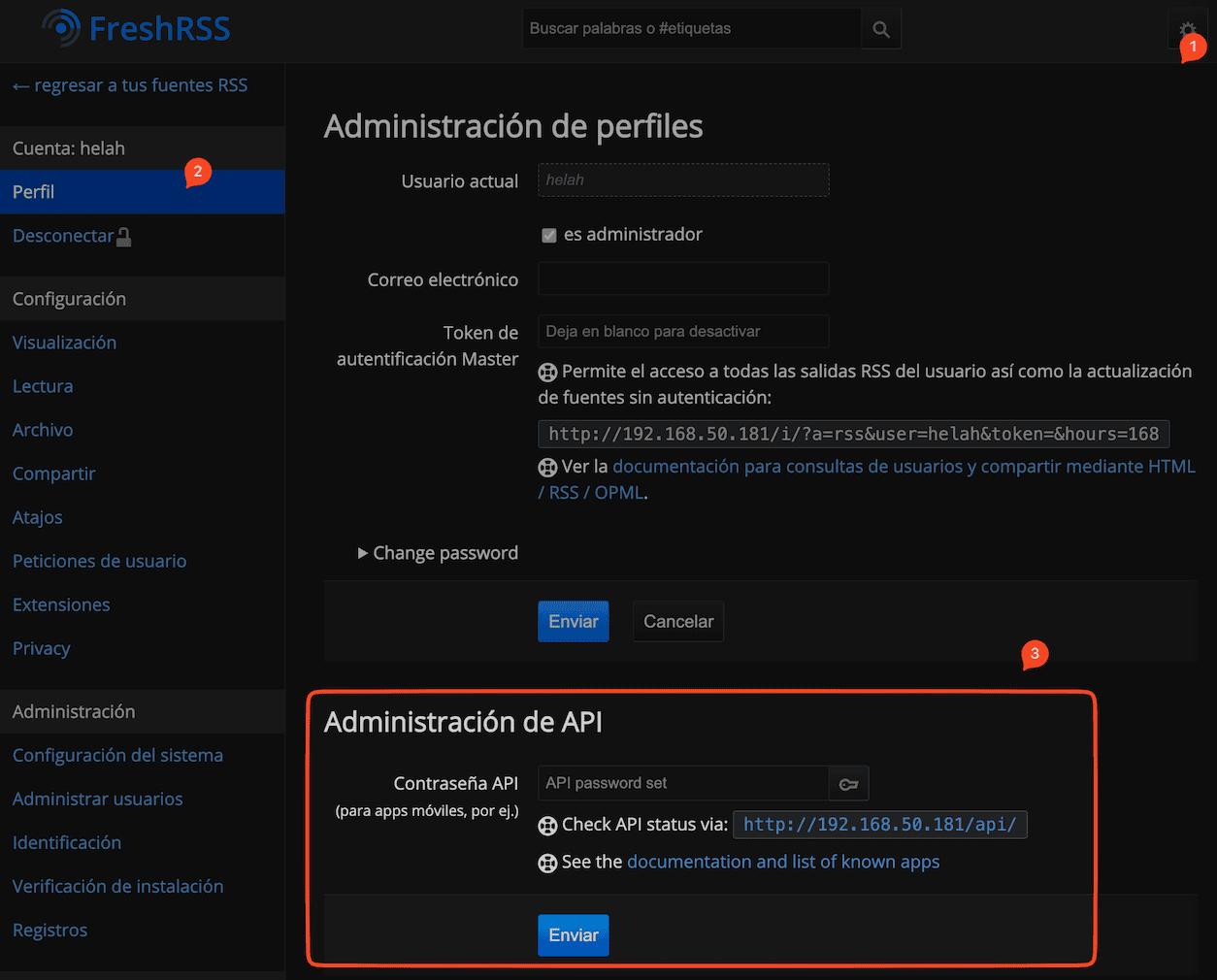 - Password de la API recien creado (NO es el password de tu cuenta de FreshRSS)