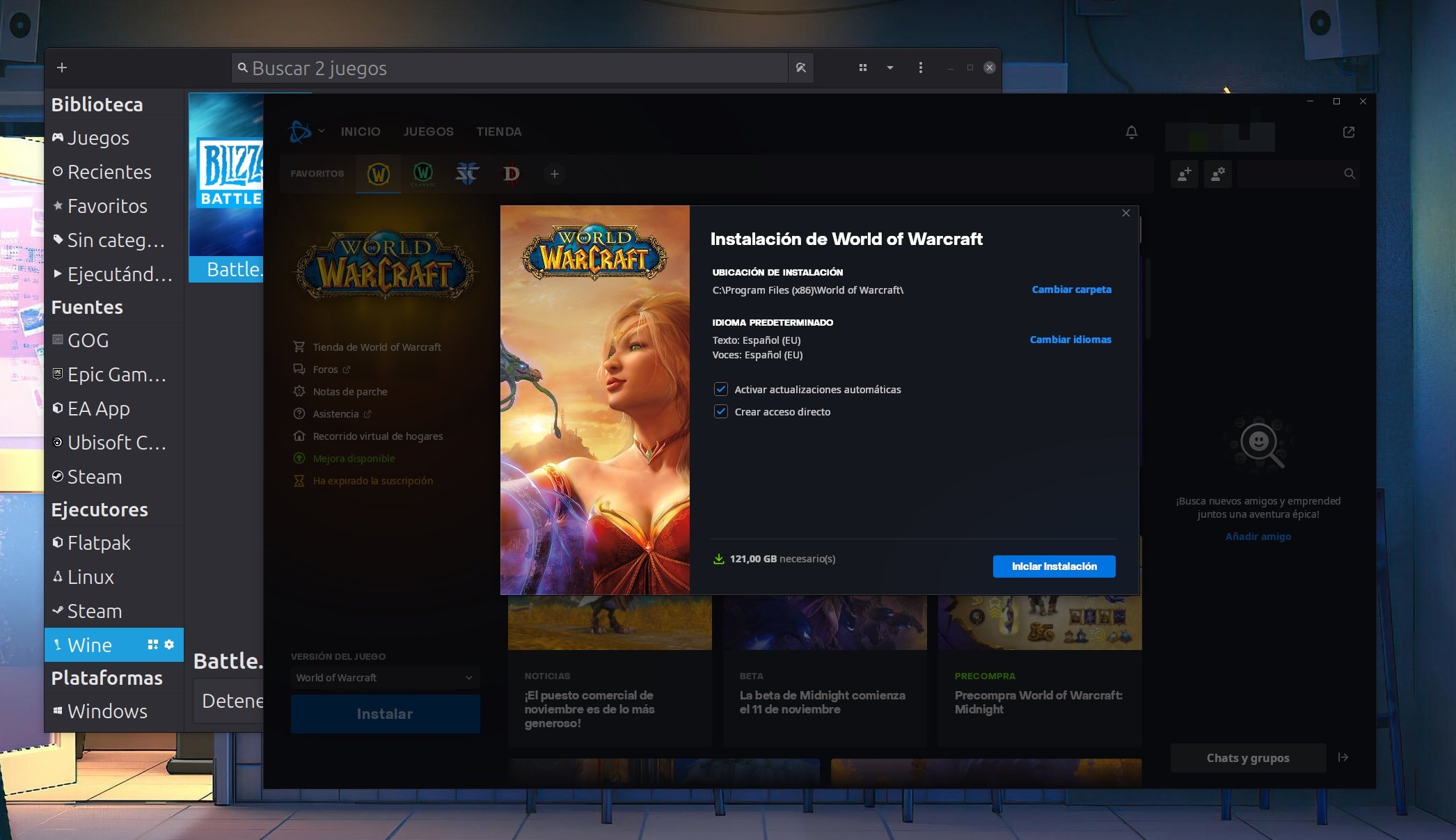 Ahora instalamos el paquete de battle.net para World of Warcraft: https://lutris.net/games/world-of-warcraft/ (si quieres jugar solo a este juego) o el general de Battle.net en https://lutris.net/games/battlenet/ (para jugar a todos tus juegos) y luego cambiamos en Wine en Lutris la versión de Proton a Proton Hotfix para que funcione (menú de la izquierda).