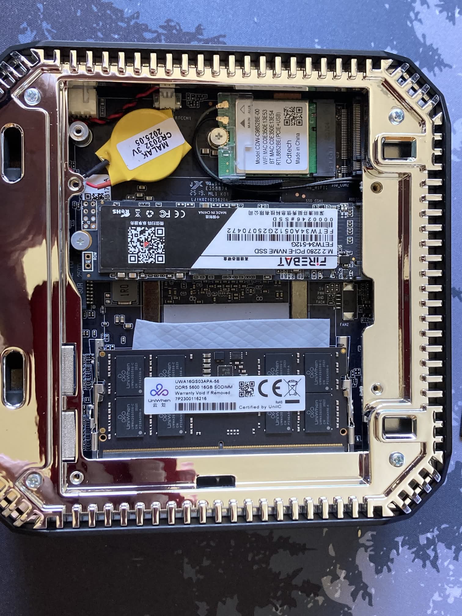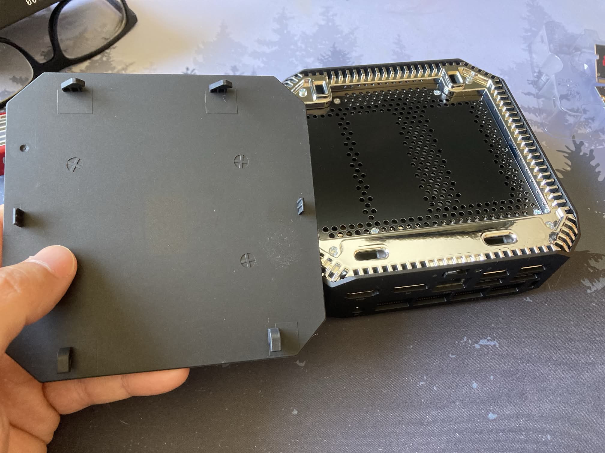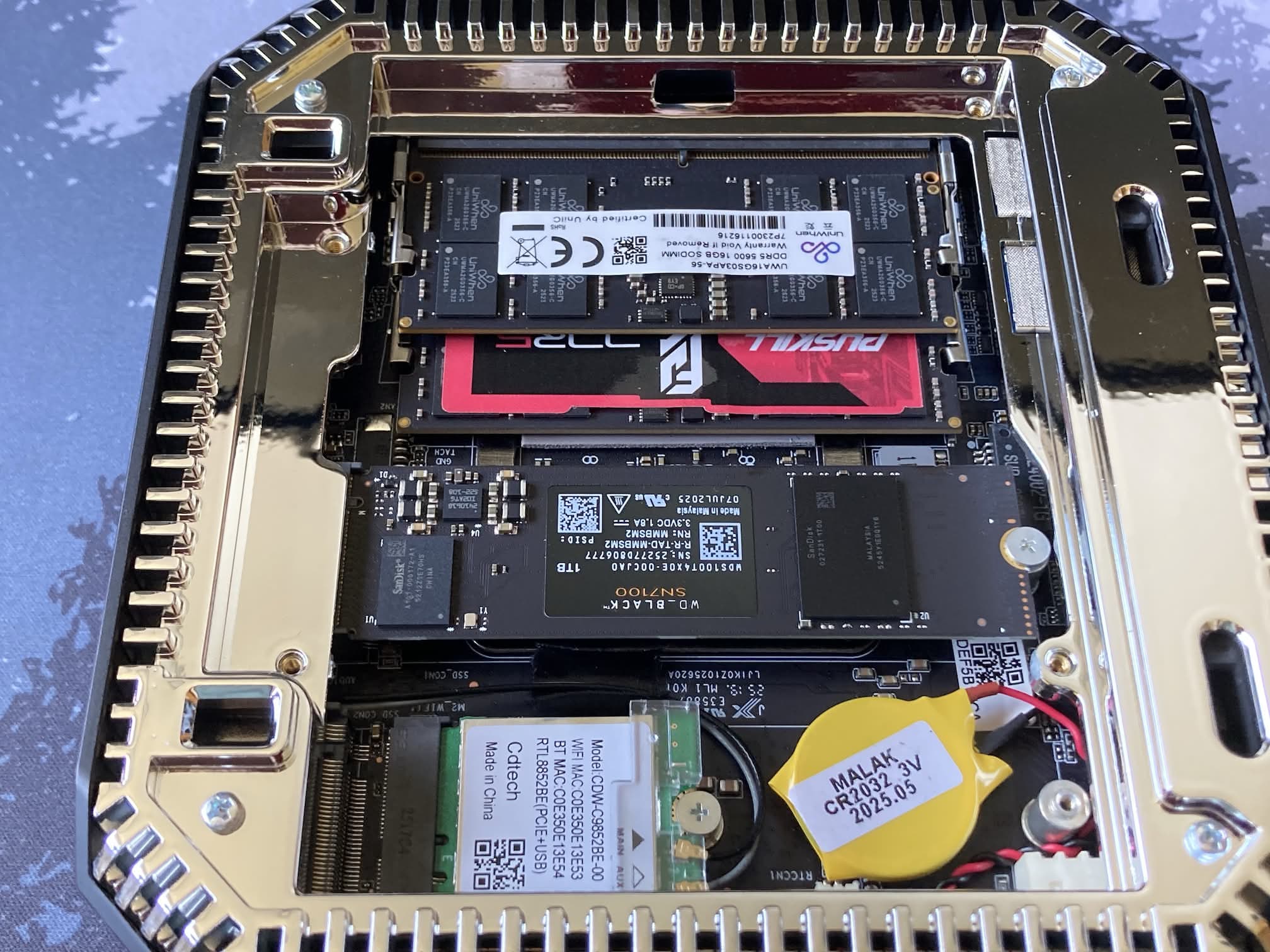 Es lo primero que hemos hecho para instalar 16 GB de memoria RAM adicional (PUSKILL DDR5 16 GB a 4800 MHz) y un nuevo disco principal de 1 TB (WD Black NVMe SN7100) mucho más rápido que el que viene con el mini PC.