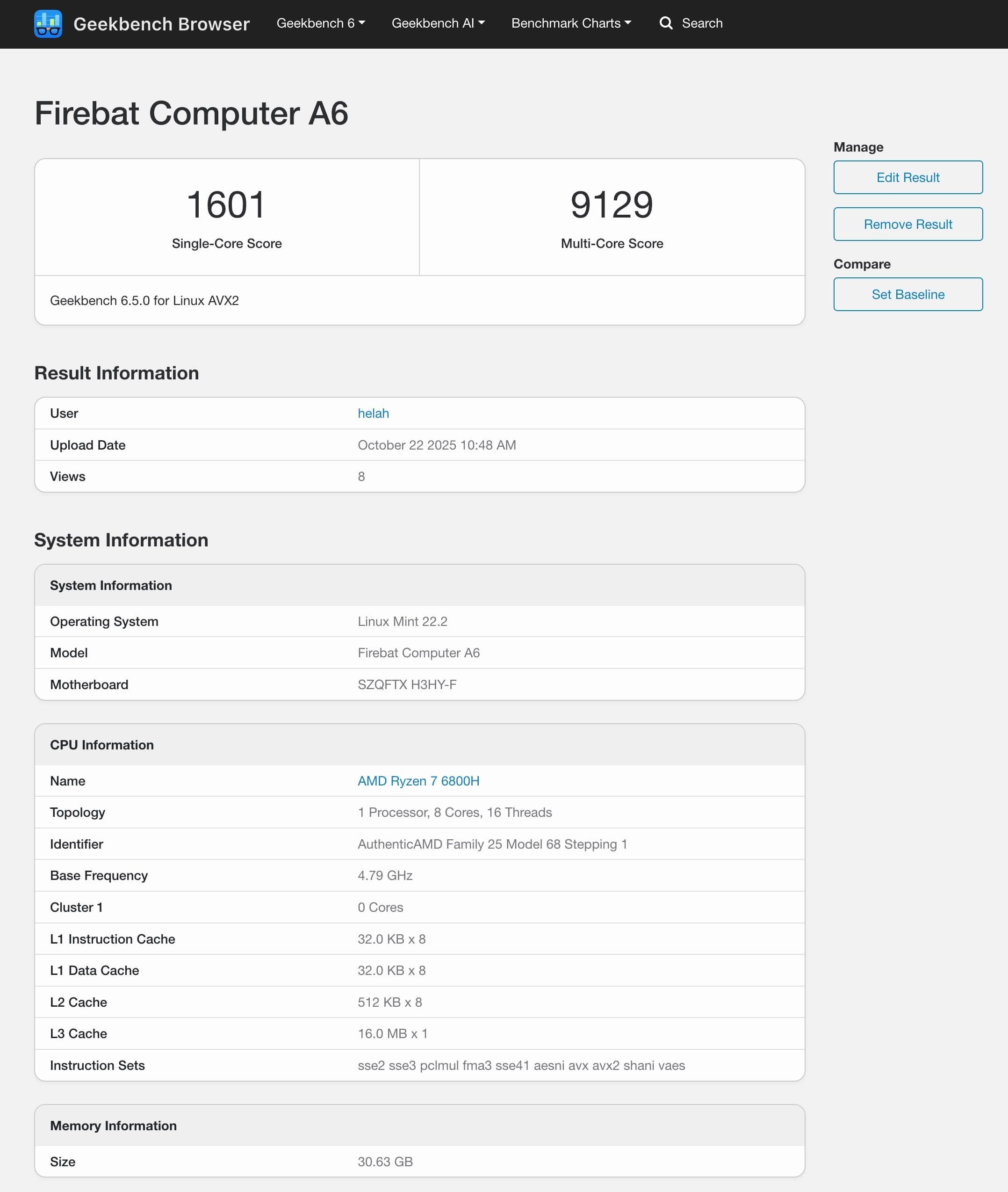 - Puntuación Single-Core (Un Núcleo): 1601 puntos. Esto es clave para la agilidad general del sistema, la respuesta de las aplicaciones y el rendimiento en juegos que no están altamente optimizados para múltiples hilos. Esta puntuación coloca al Ryzen 7 6800H en un nivel de rendimiento de gama alta. Garantiza unos tiempos de respuesta mínimos y un alto rendimiento en la mayoría de juegos.