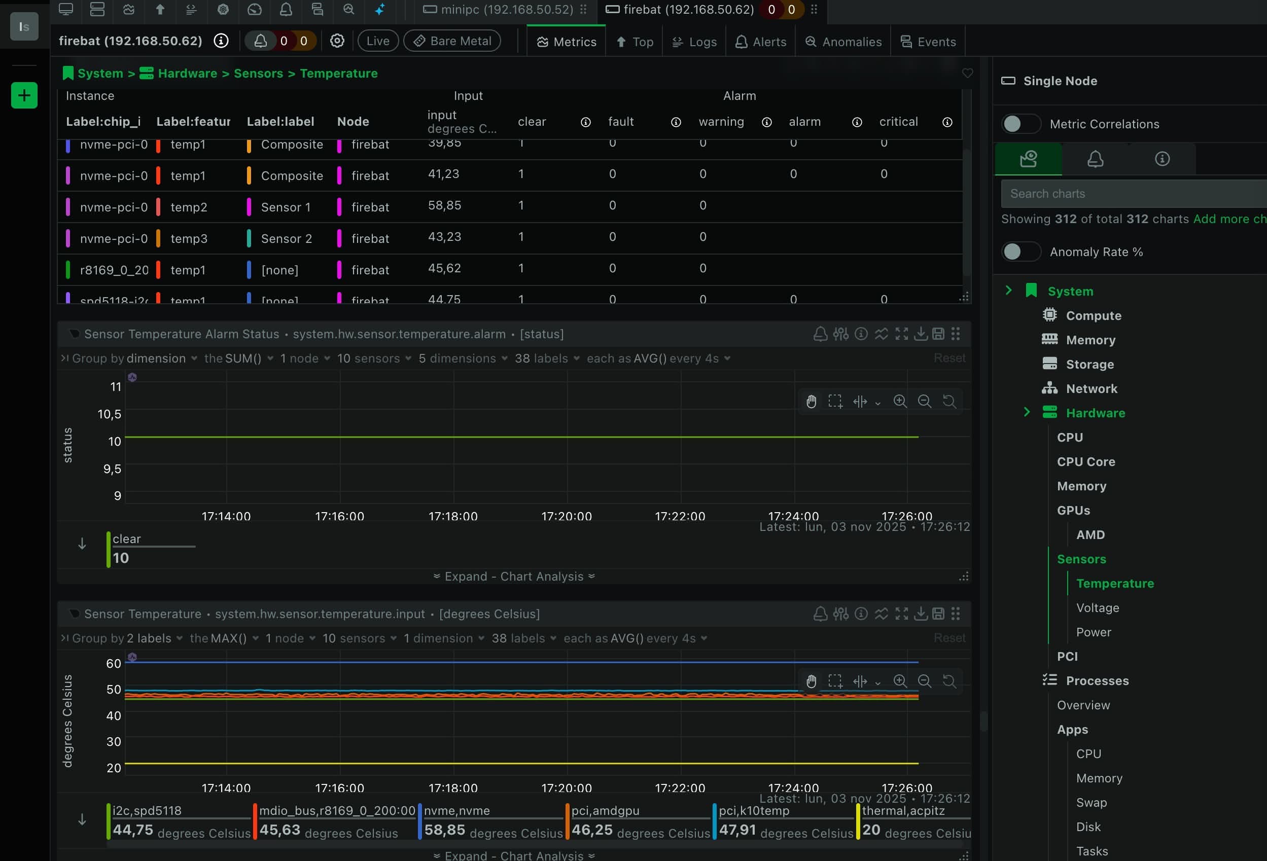 Las temperaturas tanto de discos duros como de CPU se mantienen estables y siempre fuera del rango máximo. Tenemos el software de Netdata instalado en el mini PC para controlar todo esto en tiempo real.