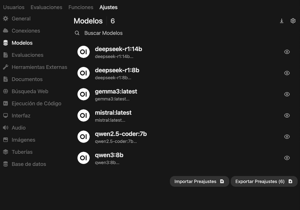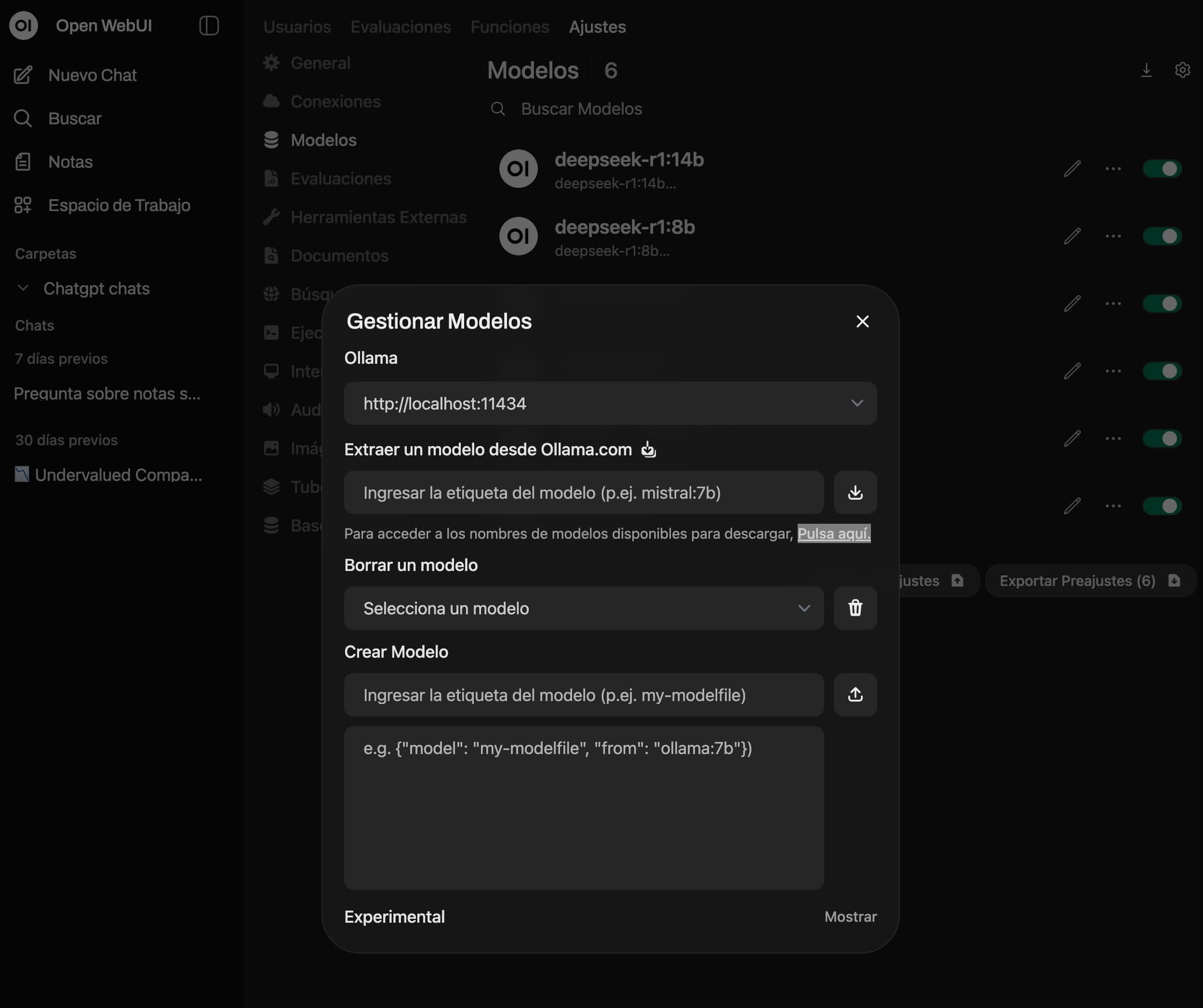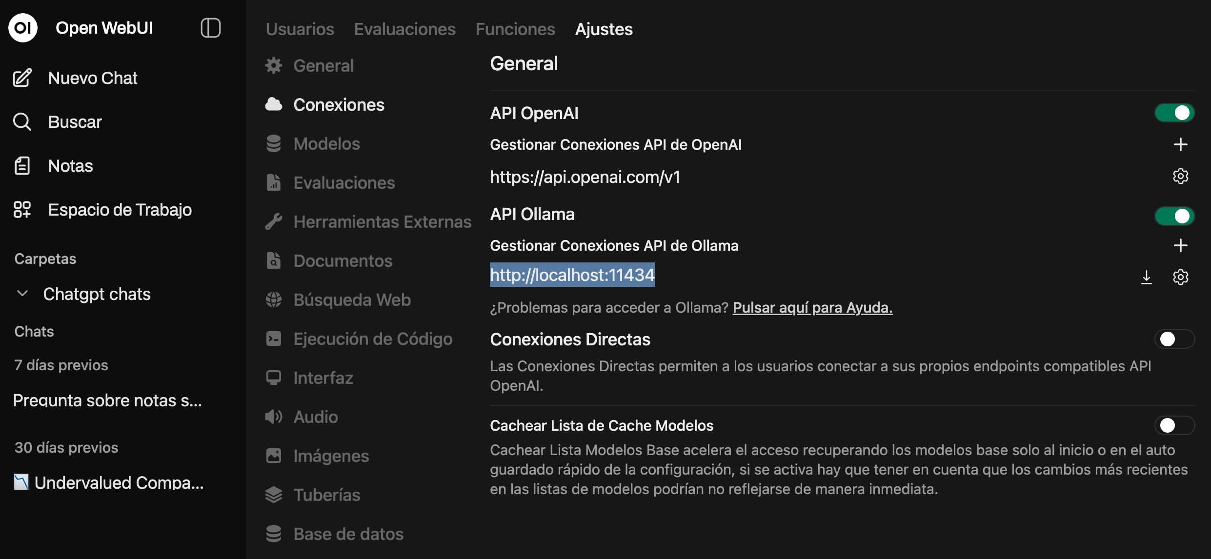 En esta interfaz, lo primero que tenemos que hacer es conectar Open WebUI con Ollama en Ajustes > Ajustes de Administrador > Conexiones y poner en la sección de Ollama http://localhost:11434: