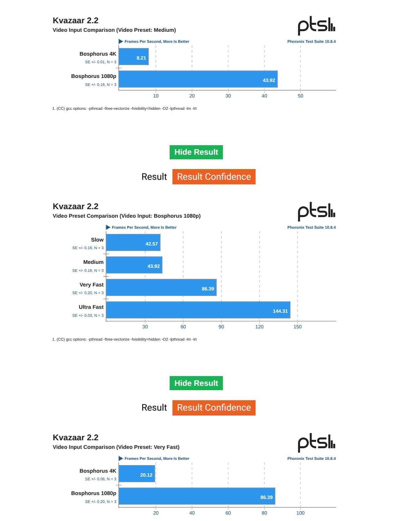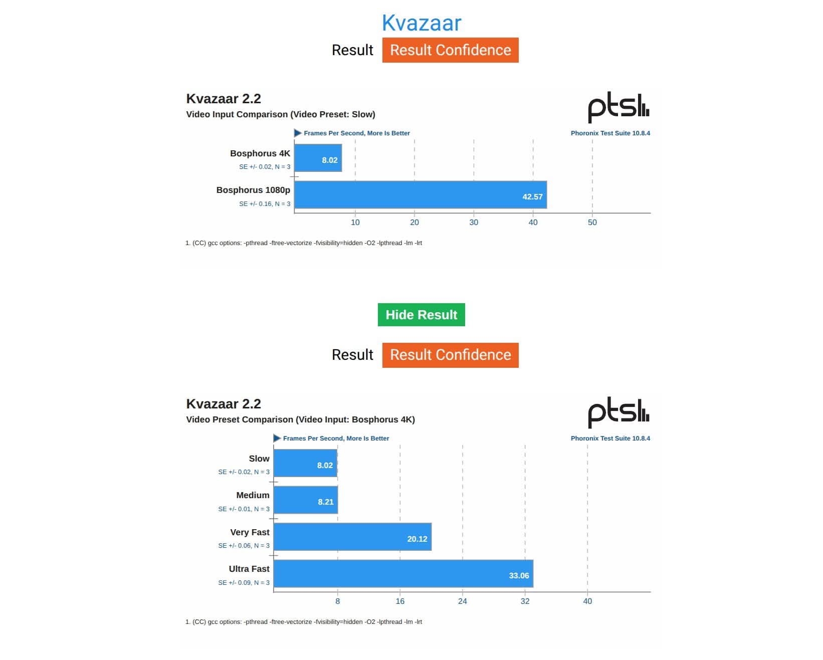- Kvazaar (HEVC): Rendimiento sólido, desde 8.02 FPS en preset Slow (máxima calidad) hasta 144.31 FPS en Ultra Fast (1080p).