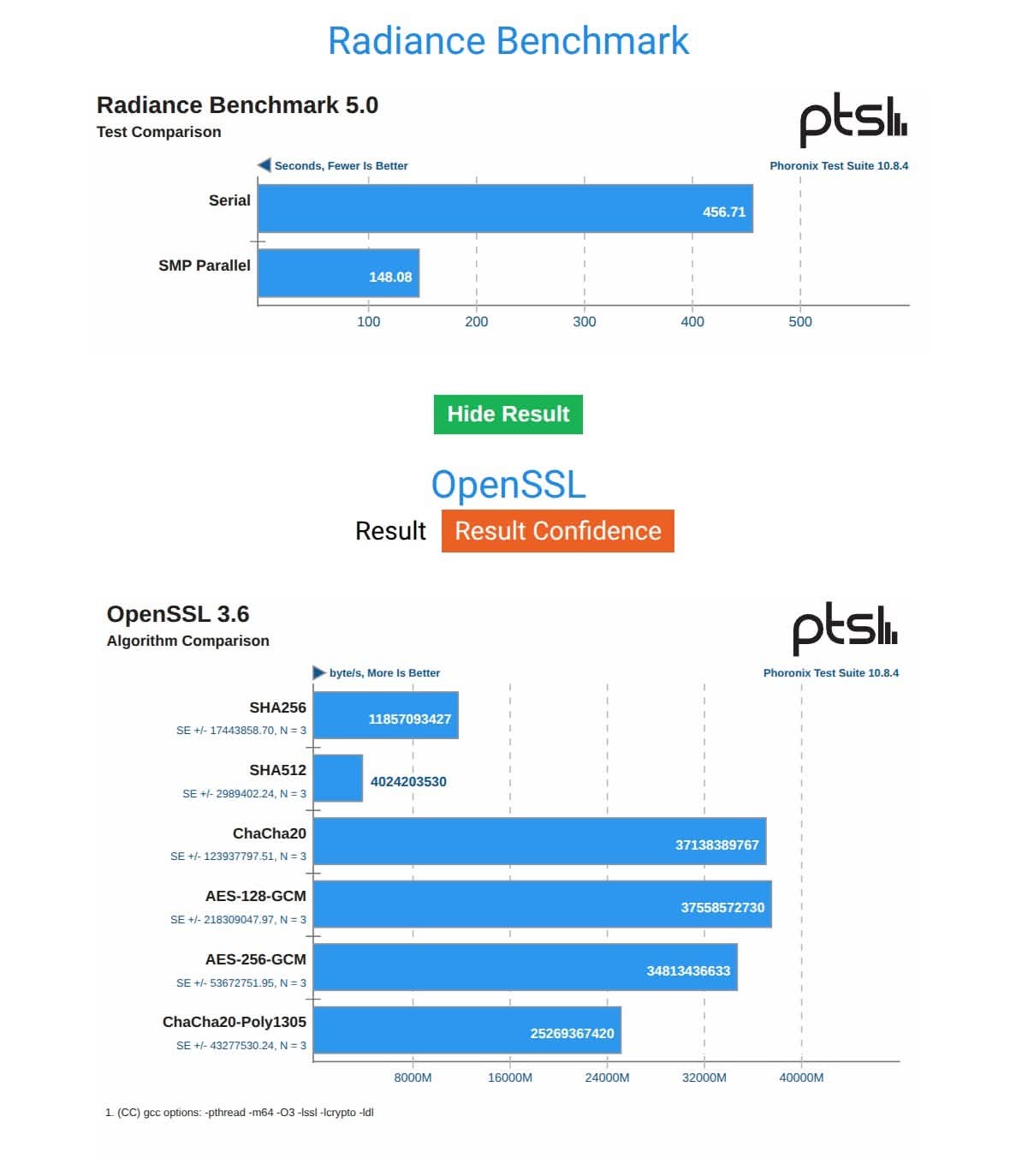 - OpenSSL (AES-256-GCM): ~34.8 GB/s. Un ancho de banda de cifrado espectacular, crucial para la seguridad de las comunicaciones y el rendimiento de sistemas seguros.