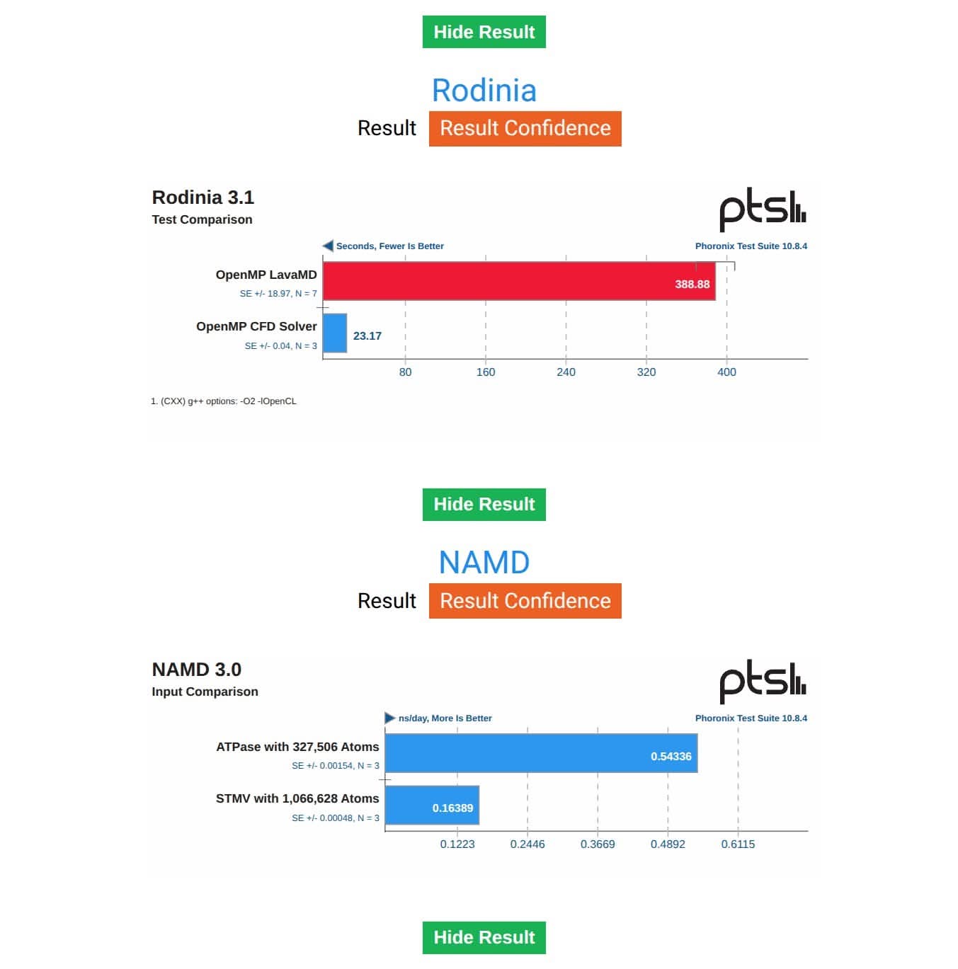 Pruebas como Rodinia y NAMD simulan cargas de trabajo de investigación e ingeniería.